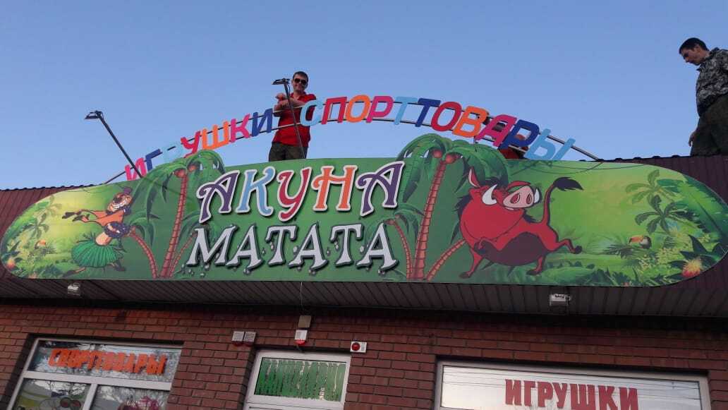 А это история про магазин «Акуна Матата» на Новом вокзале. Нужно было заменить фасадную вывеску — яркую, но не световую. Макет отправили в печать, монтаж назначили на пятницу.